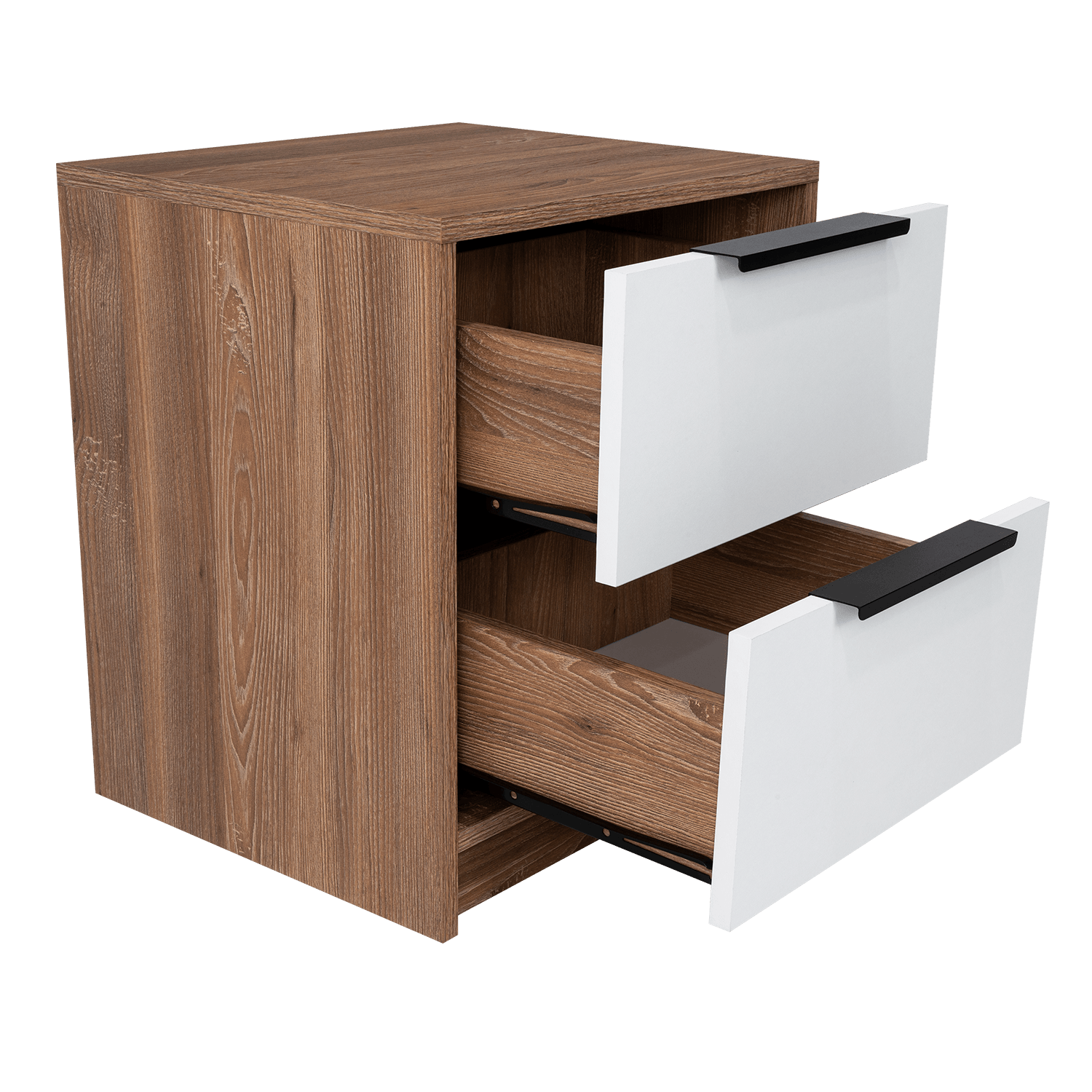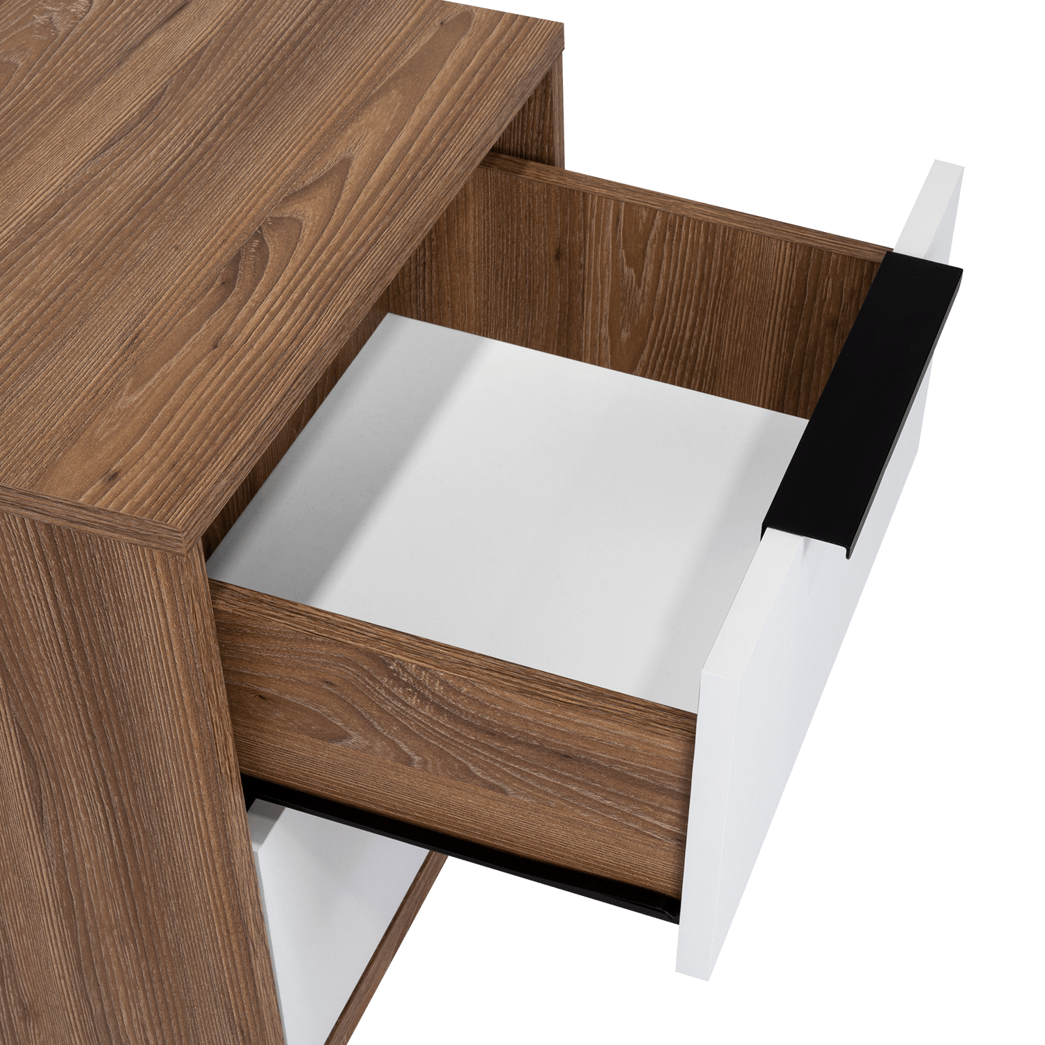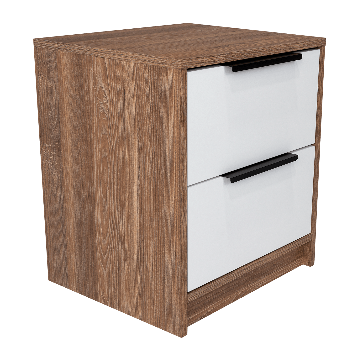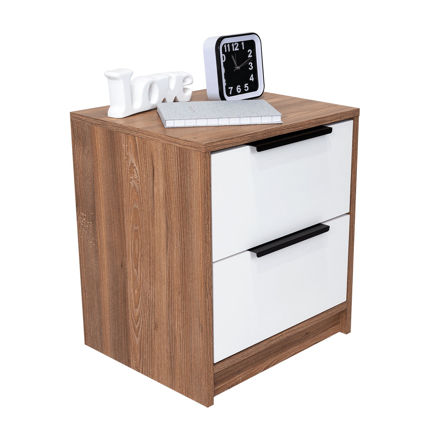 Table de chevet avec 2 tiroirs, conçue en panneaux de bois aggloméré (MDP), recouverte de feuilles mélaminées de haute qualité. Sa combinaison de couleurs Miel et Blanc apporte une touche moderne et lumineuse à votre intérieur.