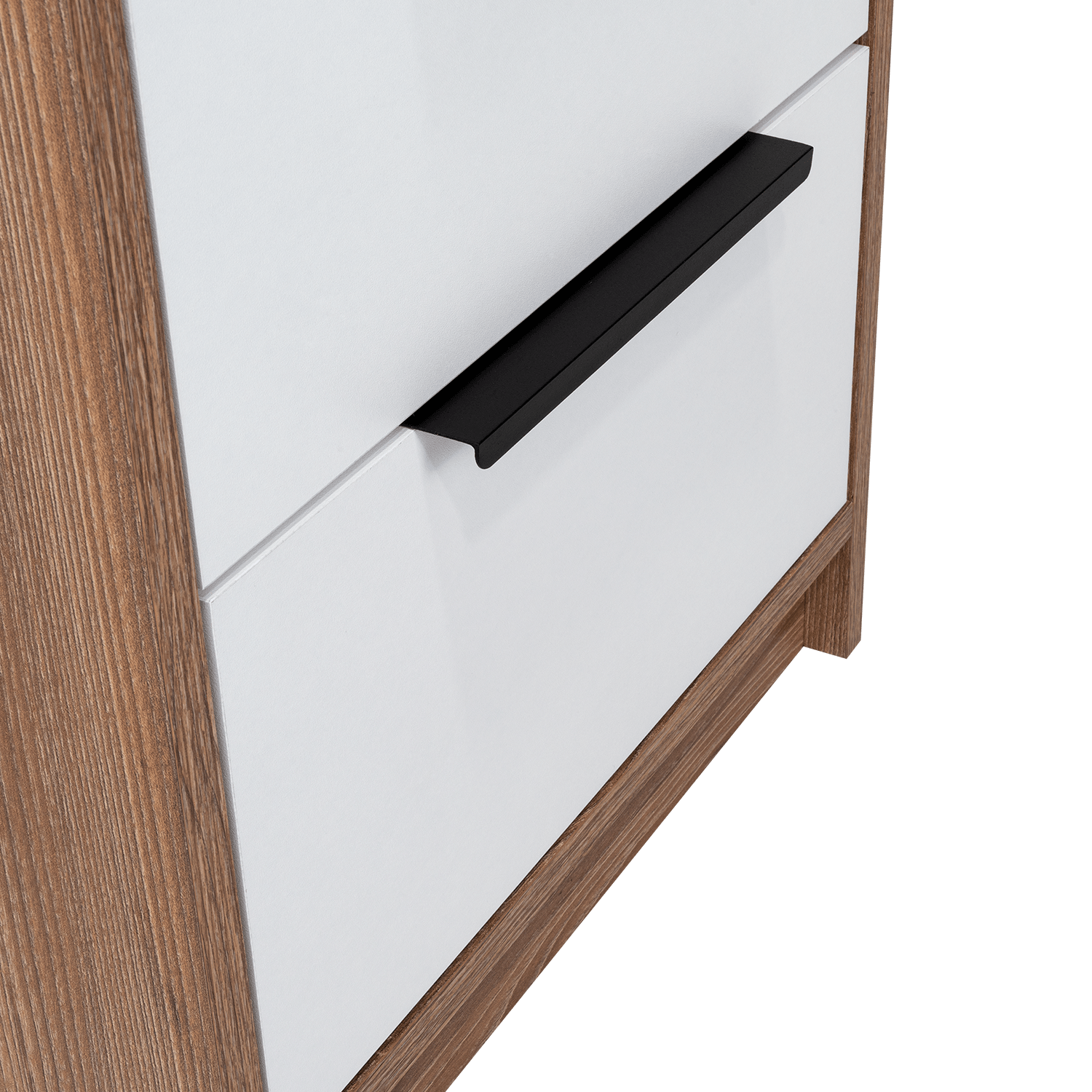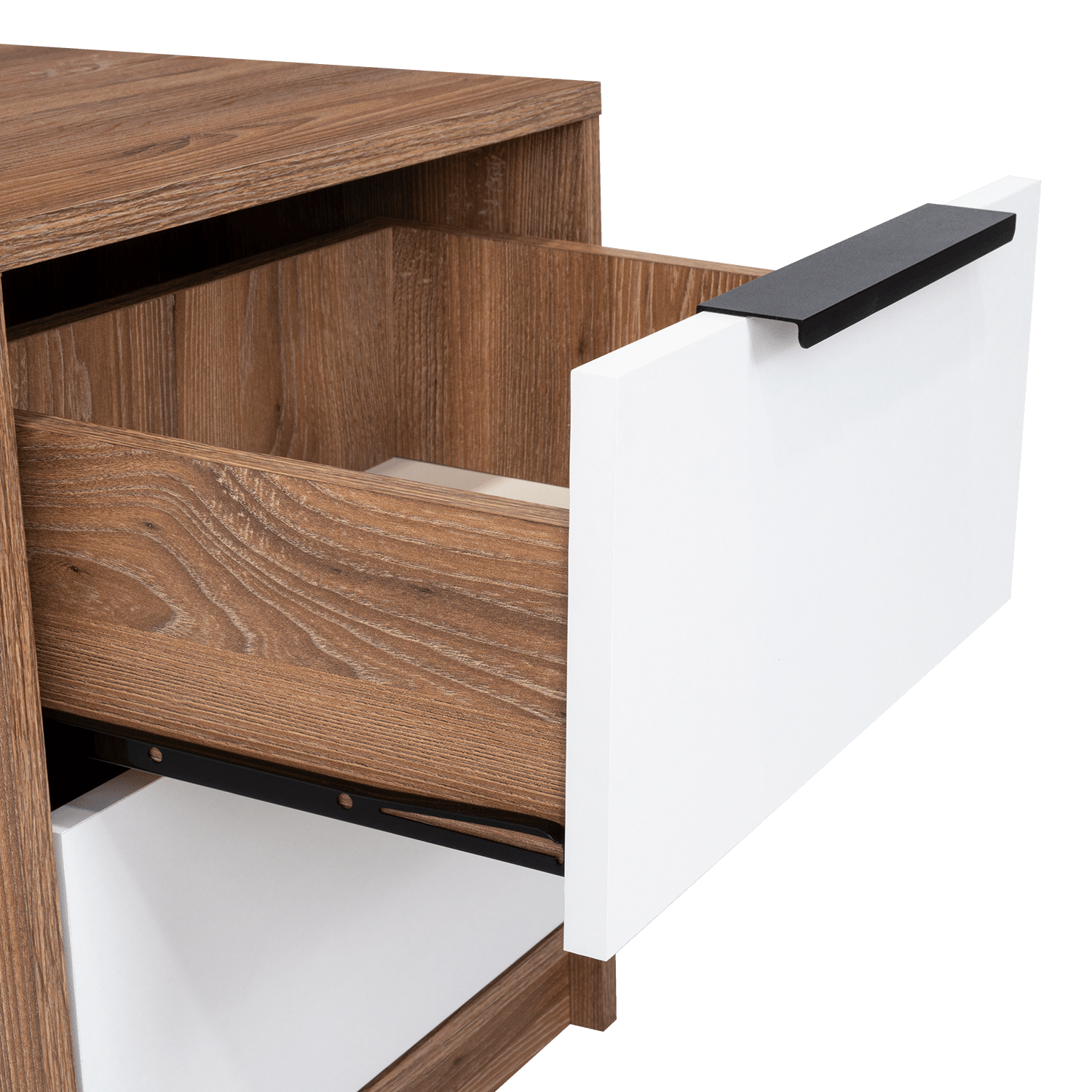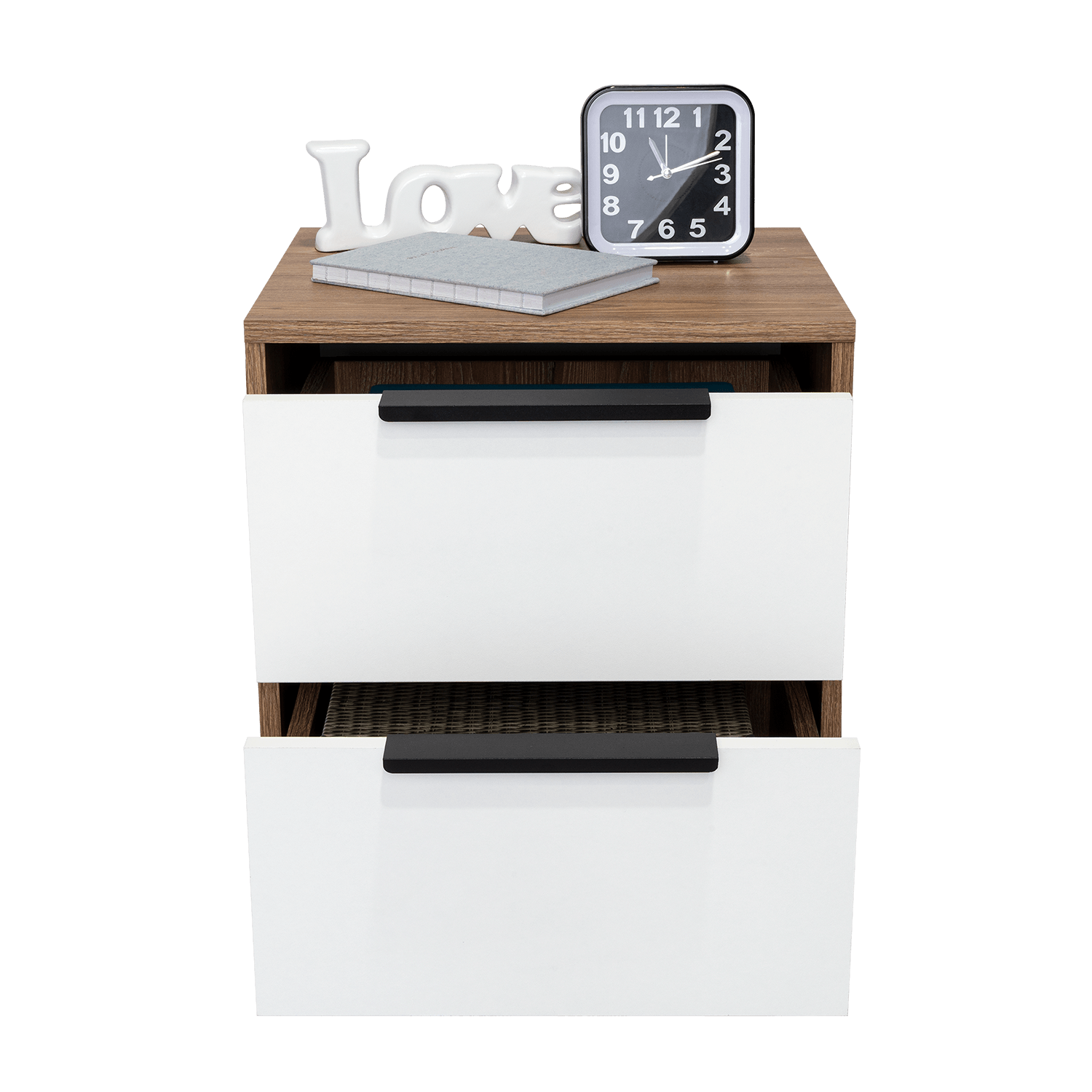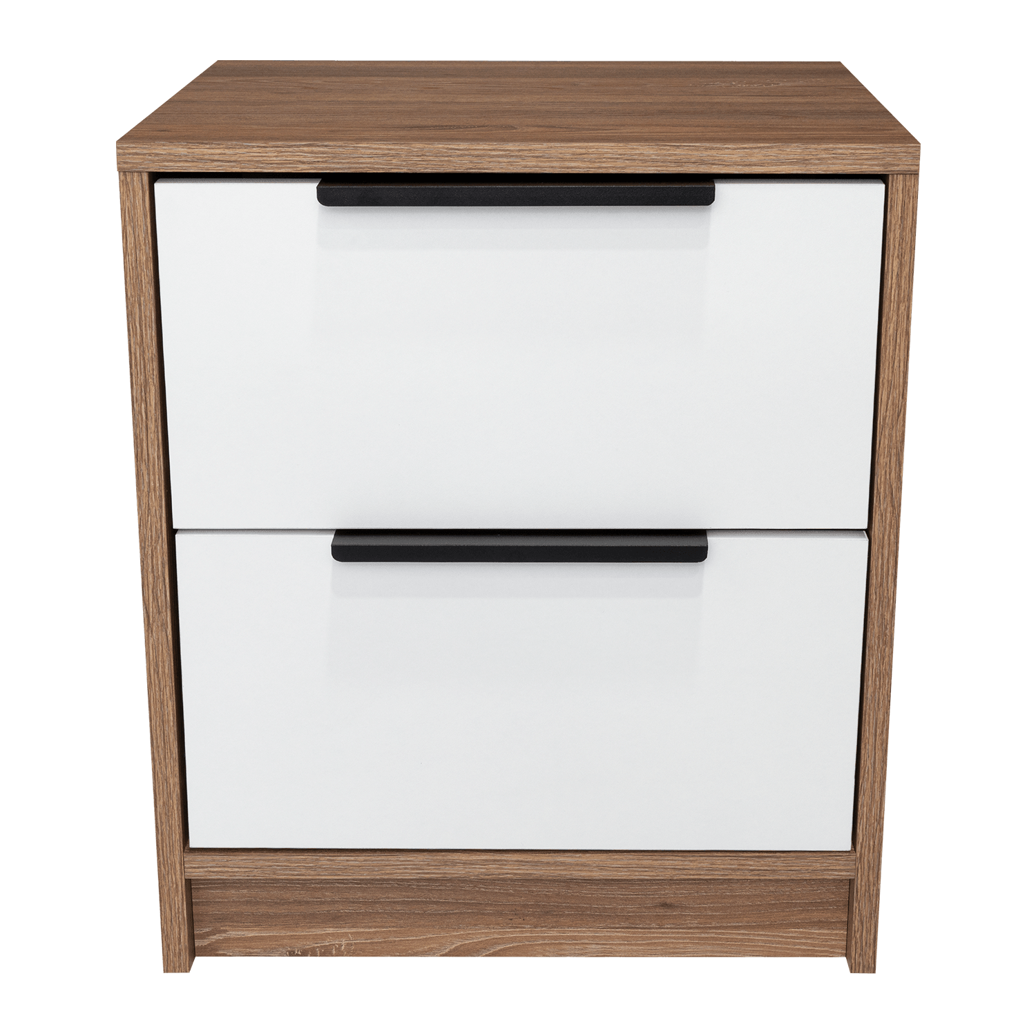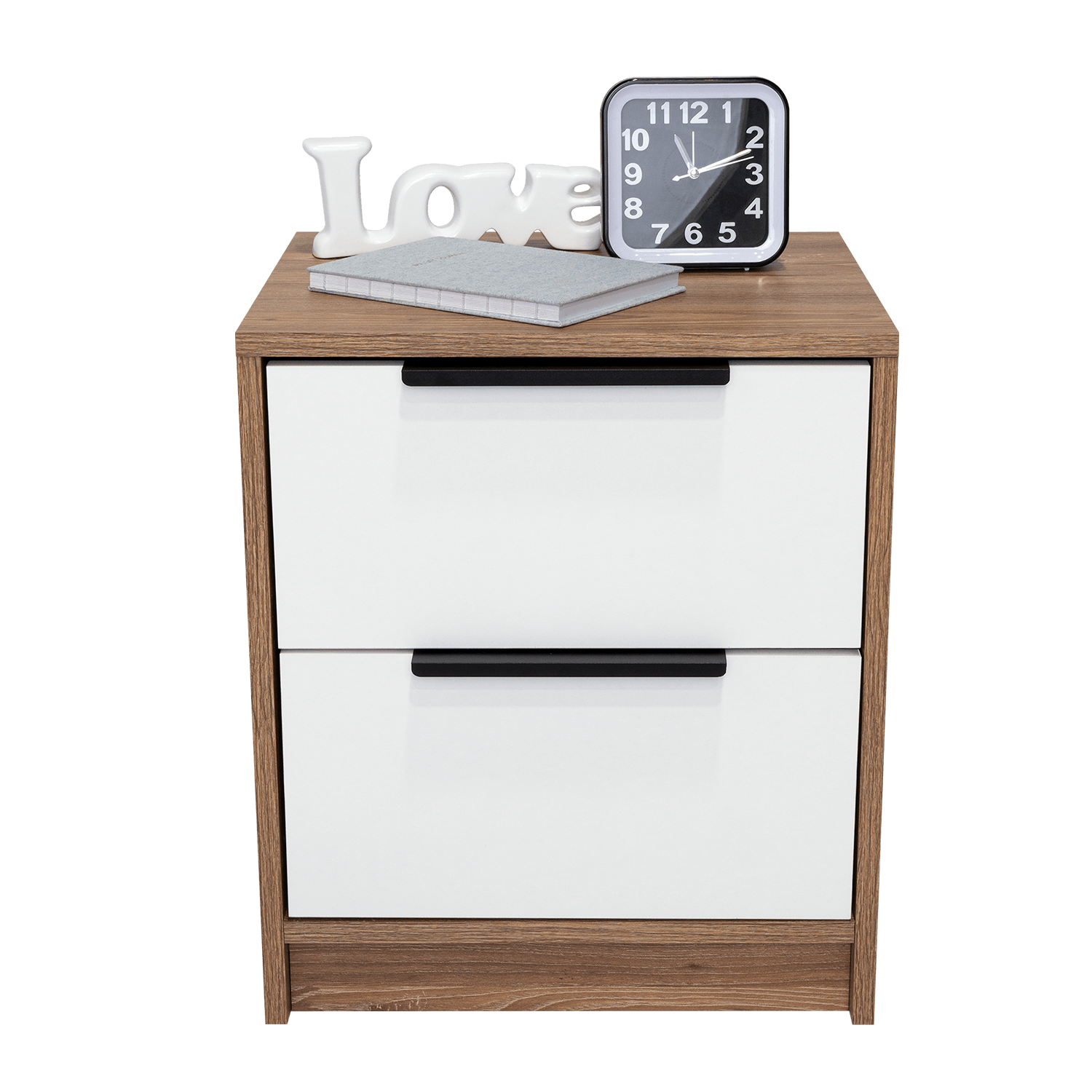 Table de chevet avec 2 tiroirs, conçue en panneaux de bois aggloméré (MDP), recouverte de feuilles mélaminées de haute qualité. Sa combinaison de couleurs Miel et Blanc apporte une touche moderne et lumineuse à votre intérieur.